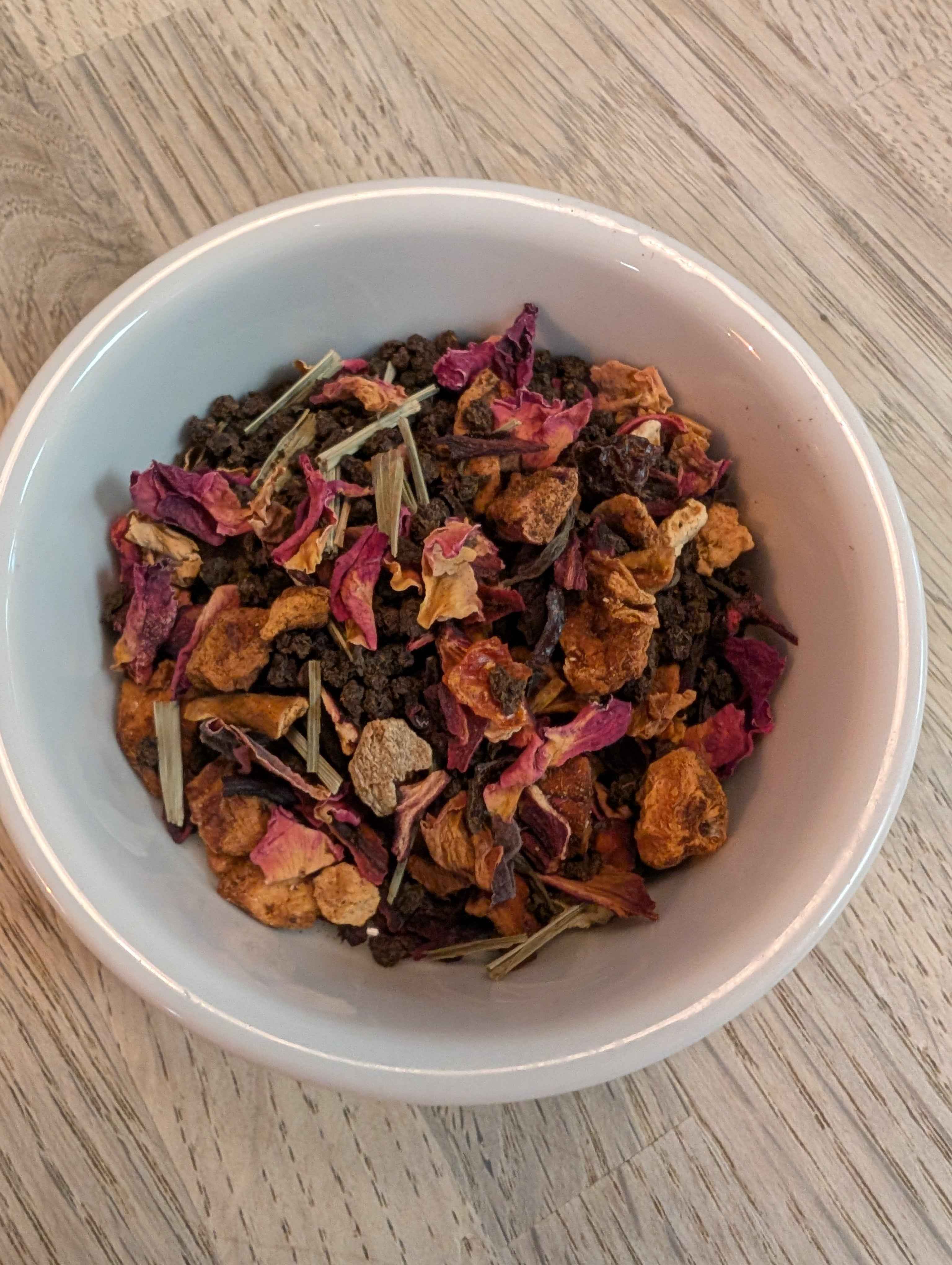 Ingredients: Assam black tea, orange pieces, hibiscus, rose petals, lemon grass