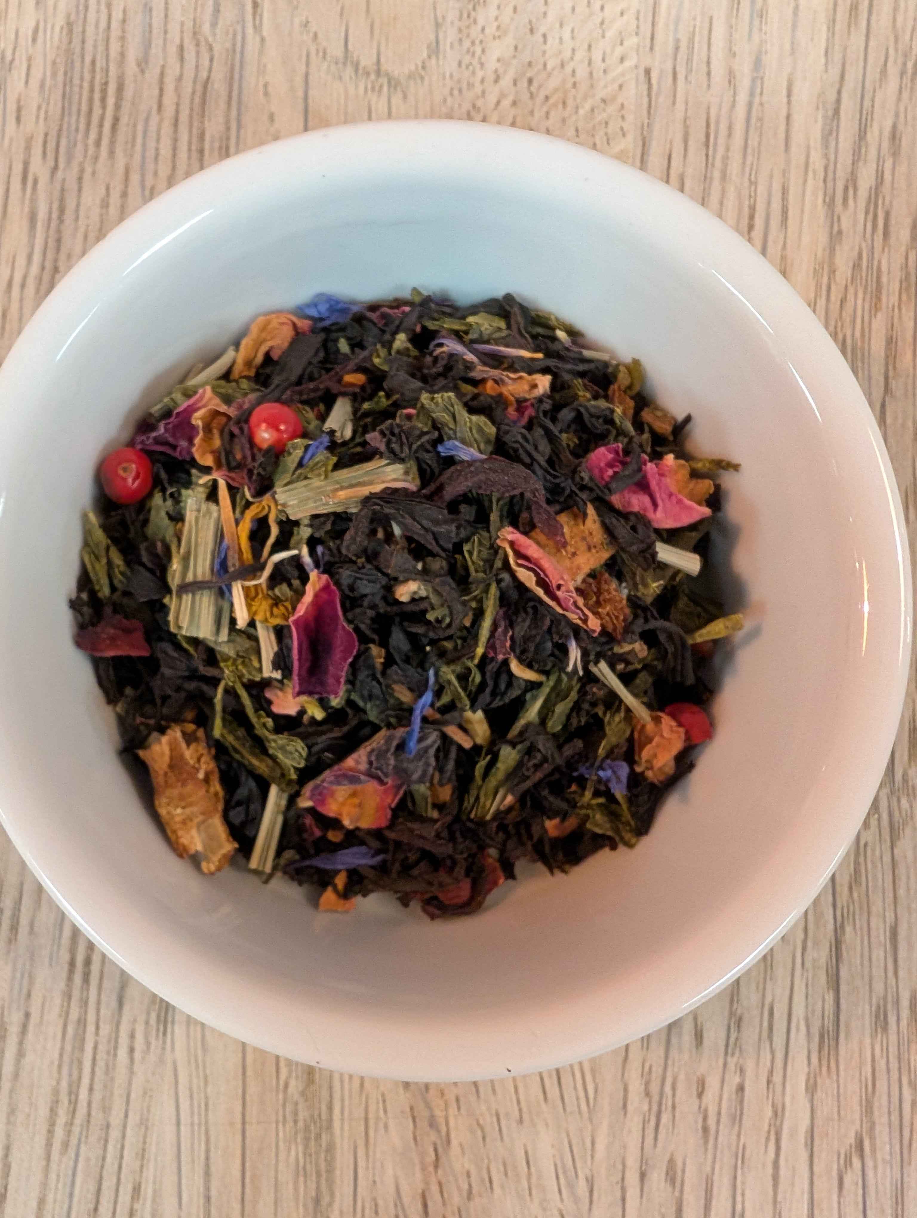 Ingredients: Black Tea, Sencha Tea, Chai Spices, Rose petals, Vanilla & Lemon grass.