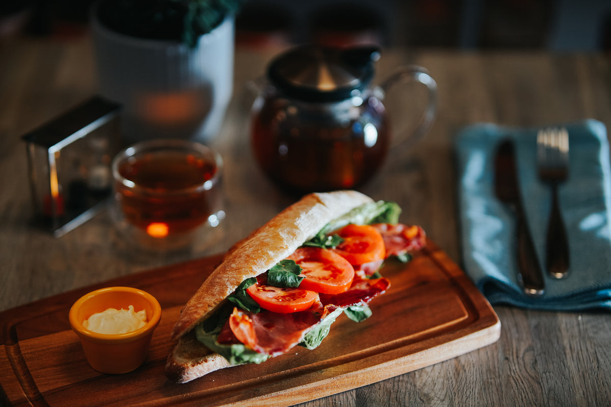 Our Breakfast menu is served until 12 noon and includes simple snacks such as hot buttered toast with Welsh salted butter and marmalade, or why not treat yourself to a toasted teacake or a couple of crumpets. For an indulgent treat our hearty bacon baguettes are hard to beat, whilst customers with a sweet tooth will find our Portuguese custard tarts hard to resist.